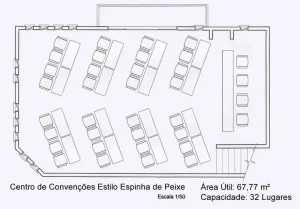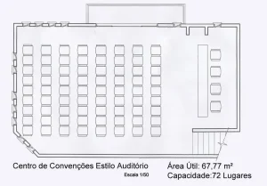 A flexibilidade dos espaços também se destaca: os ambientes comportam diferentes configurações, como auditório, formato em “U”, estilo escolar ou espinha de peixe, com capacidades que variam de 16 a 72 participantes, dependendo da disposição escolhida. Isso permite que o local se adapte com facilidade às necessidades específicas de cada evento, oferecendo praticidade tanto para encontros de pequeno porte quanto para convenções mais robustas.